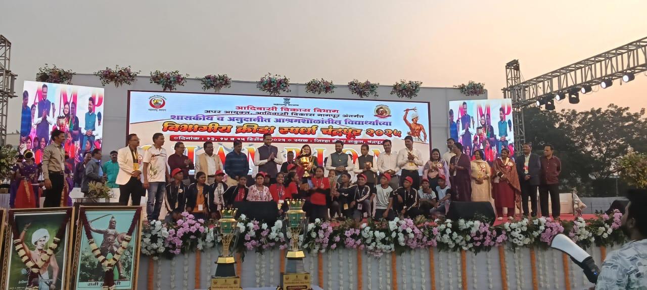 आदिवासी विभाग, अप्पर आयुक्त आदिवासी विकास नागपूर अंतर्गत शासकीय व अनुदानित आश्रम शाळांमधील विद्यार्थ्यांच्या विभागीय क्रीडा व सांस्कृतिक स्पर्धा दि. १३ ते १५ डिसेंबर २०२५ दरम्यान चंद्रपूर येथे उत्साहात संपन्न झाल्या.